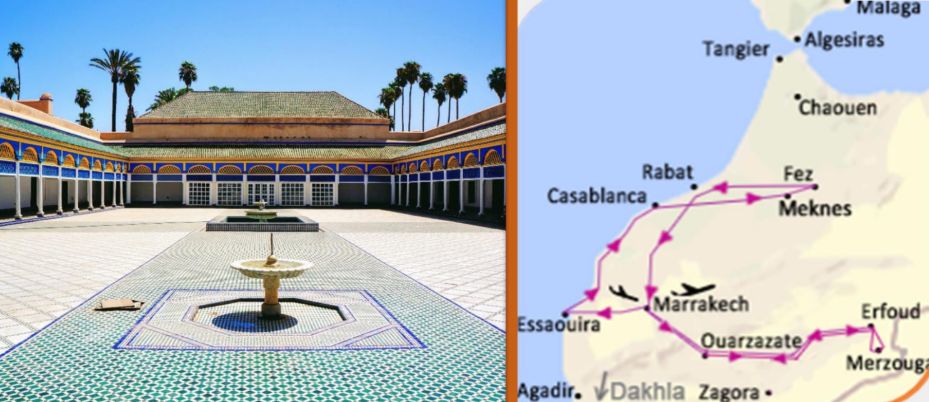 Marrakech, Essaouira, El Jadida, Casablanca, Meknes, Fez, Rabat, Ait Benhaddou, Zagora, Nkob, Tazzarine, Erfoud, Tinghir, Ouarzazate, Marrakech